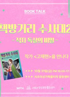 책방거리 수사대2 북토크 고재현 작가와의 만남! * 일시 : 2025. 10. 31.(금) 16:00~17:30 * 장소 : 서초여성가족플라자 잠원센터 로비 * 혜택 : 참여자 중 추첨... -
